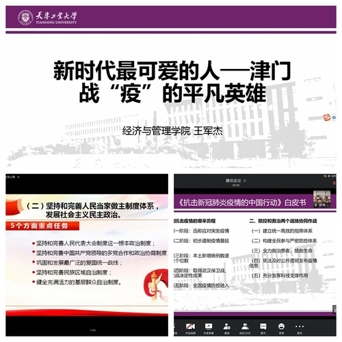学院党委书记王军杰为全体学员讲授本期分党校培训第一次“云党课”:《新时代最可爱的人——津门战“疫”的平凡英雄》和《党的十九届四中全会精神宣讲》。疫情就是课堂,王军杰在第一讲《新时代最可爱的人——津门战“疫”的平凡英雄》中结合《抗击新冠肺炎疫情的中国行动》白皮书的主要内容,向入党积极分子们宣讲疫情防控取得的重要阶段性成果,是在习近平总书记和党中央英明领导下取得的,是中国共产党团结带领全国人民万众一心、众志成城、艰苦努力的结果,是中国特色社会主义制度优越性的集中体现。随后,王军杰和学员们一起重温了津门战“疫”中平凡英雄的不平凡事迹,他结合实际和学习体会,从“什么是党性”“习近平关于党性的部分论述”“如何把握党性”等方面进行了阐述。在第二讲《党的十九届四中全会精神宣讲》中,王军杰重点阐明了全会的重大意义,阐释了中国特色社会主义制度和国家治理体系的显著优势,围绕全会提出的总体要求、总体目标和重点任务进行了系统解读,对学习宣传贯彻全会精神、坚定制度自信谈了认识体会。他指出,全会取得的重要成果、作出的重大部署,必将有力推动各方面制度更加成熟定型,不断把我国制度优势转化为国家治理效能。他还利用这次党课,专门针对大学生参军入伍进行了详细的政策讲解和动员。