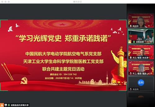 为庆祝中国共产党成立99周年,全面落实新时代党的建设总要求,回顾党的光辉历史,宣传党的光辉历程和丰功伟绩,激励广大党员担当作为,更好地发挥战斗堡垒和先锋模范作用,2020年7月3日下午,生命学院智医教工党支部联合中国民航大学电动学院航空电气系党支部通过线上方式,组织开展“学习光辉党史,郑重承诺践诺”主题党日活动,向建党99周年献礼,两个支部全体党员参加了此次活动。
