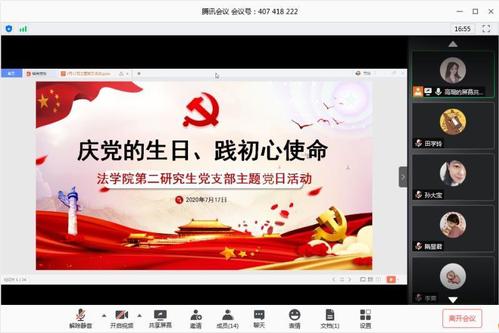 为隆重庆祝中国共产党成立99周年、不断巩固“不忘初心、牢记使命”主题教育成果,强化党员党性观念和宗旨意识,激励党员树立崇高理想和坚定信念,根据学校和学院党委部署,2020年7月17日,法学院第二研究生党支部以线上形式组织开展了“庆党的生日、践初心使命”主题党日活动。在支部书记高琨同志的组织策划下,支部党员结成3个学习小组。按照学习安排,支部委员带领全体党员回顾党的光辉历史,学习习近平总书记6月29日下午主持中共中央政治局就“深入学习领会和贯彻落实新时代党的组织路线”举行第二十一次集体学习时的重要讲话精神,学习习近平总书记给复旦大学青年师生党员回信精神,收看《战“疫”一线党旗红》公益专题片。各位党员在认真学习的基础上,结合自身感悟,开展交流研讨,品读历史、共话初心。法学院副院长付大学同志作为支部联系人参与并指导了此次主题党日活动。