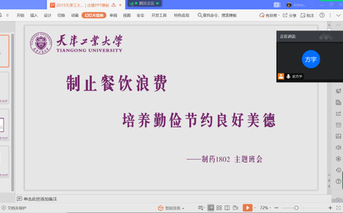 为贯彻落实习近平总书记关于坚决制止餐饮浪费行为切实培养节约习惯的重要指示精神,大力弘扬中华民族勤俭节约的传统美德,培养大学生树立勤俭节约意识,8月18日至24日,化工学院本科生和硕士研究生各班级利用网络组织召开了以“厉行节约、反对浪费”为主题的班会。