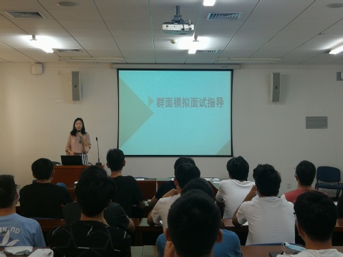 刘悦女士结合部分学生的简历,详细讲解了如何制作一份出色的简历,以点带面鼓励同学们持续优化求职简历。讲解个人模拟面试时,刘悦女士从个面模拟的前、中、后三方面为同学们讲解。提醒毕业生在面试前要做好充分的准备,结合实例强调了个面时可能遇到的问题和注意事项,以及提问环节应该问什么问题最能给面试官留下好印象。最后,刘悦女士带领8名毕业生通过自我介绍、小组讨论、小组总结答辩的方式进行了群面模拟,为在场同学真实再现面试场景,为仍处于困惑中的同学指点迷津。