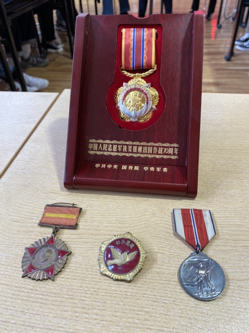座谈会在同学们热烈的掌声和殷切的期盼中开始。刘馨远老师今年89岁高龄,是一位拥有70年党龄的老党员。他佩戴着不久前获颁的“中国人民志愿军抗美援朝出国作战70周年”纪念章,为大家讲起他亲身经历的抗美援朝战争中的往事。他深情回忆了自己的成长经历,14岁当学徒,积极参加生产和革命活动,19岁加入中国共产党,之后支援东北建设,积极报名参加抗美援朝战争,战争胜利后辗转来到天工大,一路走来一直坚持学习,坚持追求进步。当讲到同学们最关注的问题,也就是参与抗美援朝战争的经历时,刘老师从战争发起的背景和原因讲起,谈到自己是如何报名参战,也讲述了战争的残酷和志愿军的英勇不屈和大无畏精神,这些至今都让他难忘,也使在座的同学们深受触动。在战场九死一生,经历了重重考验,能在胜利后顺利回国是他的幸运,也让他有幸看到祖国的不断进步与强大。刘老师说:“我们参加中国人民志愿军,就是为了保家卫国,保卫共产主义。战争的胜利,是志愿军战士用生命拼出来的。我们心中有一个信念:不打败美帝国主义决不收兵。”在谈到与自己一同参战的五位战友有三人都牺牲了,刘老师满怀对战友的敬意和怀念,向大家一一传阅自己与战友和家人的珍贵照片。刘老师的生动讲述让大家仿佛穿越时空,回到过去,很多感人的事迹让同学们流下泪水。