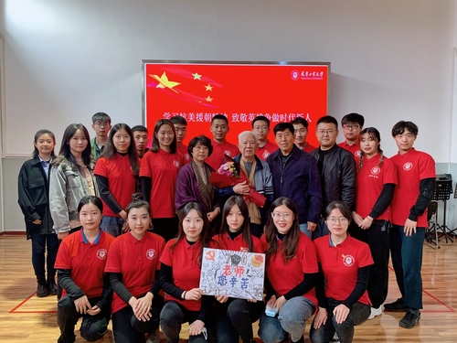 重温历史是为了激励未来。刘老师一方面用亲身经历激励同学们,让大家从鲜活悲壮的历史中汲取到信仰的能量,另一方面不忘勉励青年学生要有信仰有追求,要坚决拥护中国共产党,坚信共产主义;要时刻牢记党的宗旨,牢记青年一代的时代使命,不忘初心,真诚为人民服务;要认真学习,学好本领,为服务人民、奉献国家打好基础;还要养成终生学习、与时俱进的良好习惯,尤其要学好党史、革命史,懂得过去的历史,才能走好将来的路。同学们深受鼓舞,送上自己手工制作的祝福卡片表达对老英雄的敬意和爱戴。大家争相与刘老师合影,为这次难得的学习与交流留下珍贵记忆。
