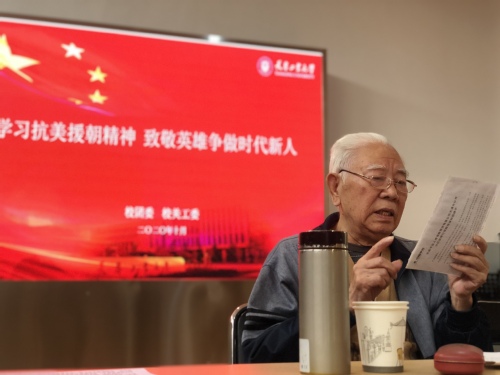 为进一步发扬抗美援朝精神,传承红色基因,坚定理想信念,2020年10月29日上午,在校关工委和校团委的组织下,我校“青马四期”学员与校院团学骨干开展“学习抗美援朝精神,致敬英雄争做时代新人”为主题的座谈交流活动。这次活动邀请到参加过抗美援朝战争的志愿军战士、我校退休教师刘馨远老人给同学们一起分享那段难忘的经历。