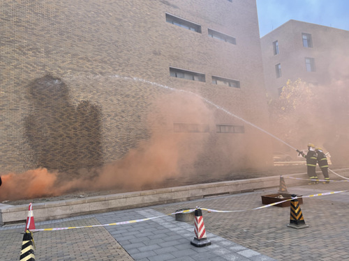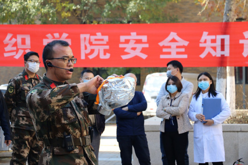 接着,进行了消防安全知识和防火技能培训。微型消防站副站长侯富强向在场师生讲解并演示了防毒面罩使用方法和灭火毯的操作步骤。保卫处老师强调如何了如何安全逃生以及机动车、共享单车和其他物品堵塞消防通道的危险性。最后,师生代表进行了灭火器灭火演练。参与实操的师生,面对大火,沉着冷静地按照灭火步骤和方法,将燃起的浓烟大火迅速扑灭。