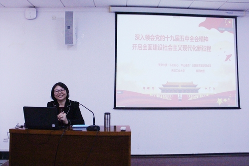 黄燕教授结合大量的史实和时事热点,从“全面开启新征程,迎来中国新发展”“认真领会精神实质,把握新发展要求”“围绕新发展目标,开启现代化新征程”三方面深入解读了党的十九届五中全会精神,回顾了党的十九届五中全会召开的历史背景,我国进入新发展阶段的重大意义、有利条件,展望了2035年远景目标,介绍了“十四五”时期我国发展的指导方针、主要目标、重大举措和建设高质量教育体系等。黄燕教授的讲座内容丰富,深入浅出,帮助学院师生进一步理解了党的十九届五中全会精神,增强了师生的思想认同和行动自觉。