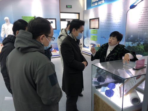 在科研成果展示中心,科学合作与成果管理处副处长张桂芳详细介绍了我校在产学研合作领域的代表性成果。特别介绍了我校在多维纺织材料设计、纤维预成型体编织、树脂传递模塑复合材料方面的研究成果,以及膜技术在污水处理、大气治理和生物医药等领域的产业化应用情况。