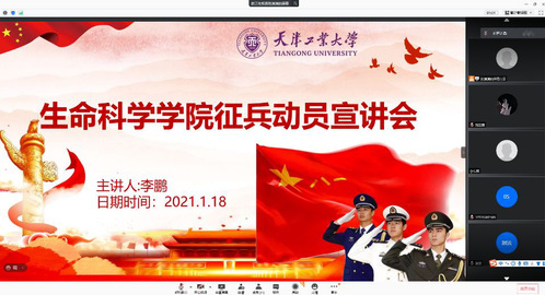 为进一步做好2021年大学生征兵宣传工作,鼓励大学生积极应征入伍,1月18日晚19点,生命科学学院召开大学生征兵动员线上宣讲会,学院大一大二全体同学参加了此次宣讲会。