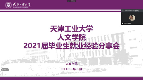 为更好地帮助2021届毕业生顺利就业,推动寒假期间各项工作的开展,2021年1月18日,人文学院举办线上就业经验分享会。参加此次会议的有2021届毕业生辅导员孔繁祎老师、就业专项工作辅导员秦皓老师、2020届各专业毕业生代表和2021届应届毕业生同学,会议由孔繁祎老师主持。