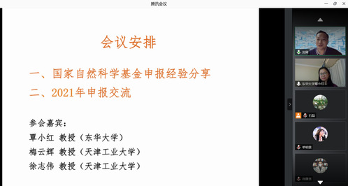 为切实做好2021年度国家自然科学基金的申报工作,进一步提升学院基金项目申报的质量,提高命中率,纺织科学与工程学院于2021年2月3日召开了国家自然科学基金申报经验线上交流会。东华大学纺织学院副院长覃小红教授、我校国家优秀青年科学基金获得者梅云辉教授和徐志伟教授受邀参加了此次交流会并分享了申报经验。学院全体班子成员以及符合基金申报条件的全体教师参加了交流会。交流会由学院常务副院长刘雍教授主持。