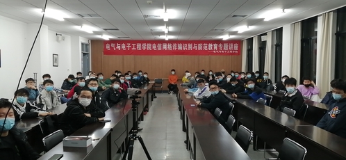 为促进学生深入了解安全知识,加强学生防范电信诈骗的意识,电气与电子工程学院于2021年3月15日在学院4A101、4A301、4A403、4B303四个会场开展由学苑派出所陈应康警官主讲的电信网络诈骗识别与防范专题讲座。学院党委副书记张谷、各年级辅导员出席,全院500多名学生参加。