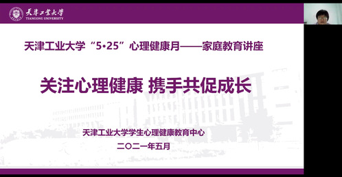 为贯彻落实《天津工业大学深入推进家庭教育实施方案》工作要求,持续加强家校协同育人,协助做好学生心理健康教育工作,2021年5月28日、29日晚,我校学生心理健康教育中心面向全校学生家长举办了题为“关注心理健康,携手共促成长”家庭教育线上专题讲座。本次讲座由党委学工部副部长楼稚明主持,学生心理健康教育中心主任邓晶晶担任主讲,300余名学生家长参加。