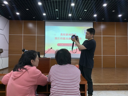 培训分为两个环节。在第一个环节,机关党委宣传部统战部党支部党员、宣传部影像宣传科科长李焕峰以《我校新闻报道照片拍摄及新闻写作》为题,围绕新闻图片拍摄、新闻摄影注意事项及新闻稿撰写三方面为师生作了精彩讲授。宣传部高泽宇老师就照片拍摄技巧与师生进行了现场讲解与互动交流。在第二环节,机关党委宣传部统战部党支部党员、统战部党派工作科科长张俊杰就统战工作与学院统战委员戴凌瑞老师进行了沟通交流,并对学院统战工作的政策把握、活动组织等难题进行了具体指导。