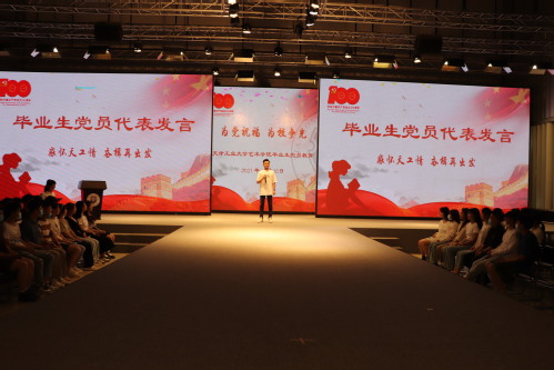 毕业生党员代表视传1704班李义以《感怀天工情,奋楫再出发》为题作了发言。他说,要在生活中给自己打一个“?”,反思缺点和不足,做到严以律己;在工作中给自己画一个“!”,敢于担当、甘于奉献;在学习中给自己留一个“……”,在党的理论钻研中力学笃行,做到学无止境。