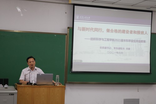 2021年6月15日上午,纺织科学与工程学院在E112教室举办了主题为“与新时代同行,做建设者和接班人”的2021届毕业生教育及党课教育大会。本次大会由学院党委副书记、常务副院长刘雍教授主讲,2021届全体毕业生通过线上线下两种形式参加。活动由团委书记(学办主任)石睫主持。