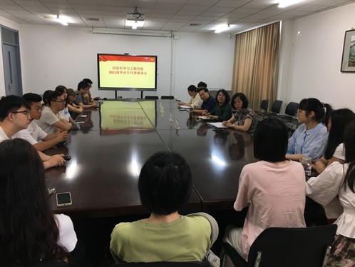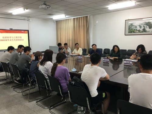 2021年6月16日,纺织科学与工程学院在学院F318召开2021届毕业生座谈会,学院党委书记胡艳丽,党委副书记、常务副院长刘雍,党委副书记石磊,副院长荆妙蕾以及毕业班学生代表参加座谈会。座谈会由石磊副书记主持。