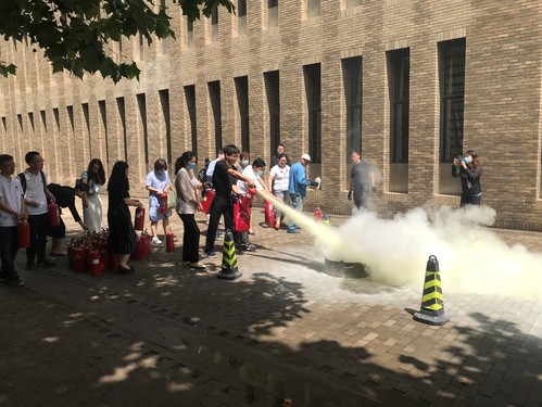 全体师生在保卫处蒋晓阳老师的指导下,在学院楼前进行灭火器使用的实操演练。师生们按照灭火器的使用步骤有序进行实践操练,取得了良好的效果,增强了师生消防安全应急处置能力。
