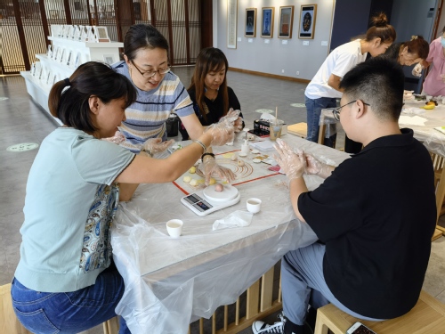 制作前,面点师将纯净的食材、精致的模具和卫生防护用品等准备就绪。活动中,面点师向师生们介绍月饼的制作流程并亲手操作示范:称分面团和馅料-揉面团-包馅-放模具内按压成型。师生们热情高涨,积极动手,看到一个个漂亮的月饼在自己的手中诞生,师生们纷纷点赞。现场氛围浓厚、热闹非凡,大家享受了一顿“丰盛”的传统文化大餐。