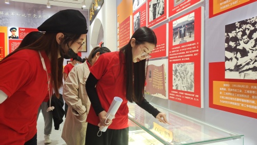 展馆正厅分为“救国”“兴国”和“强国”三个板块,分别对应“坚定信仰,救国大业”“坚定信念,兴国富国”以及“坚定信心,强国担当”三部分展览内容。展览以珍贵历史图片、精品档案和重要文献为载体,回顾党的百年奋斗历程,追忆峥嵘岁月,缅怀革命先烈。参观过程中,红色文化研究与教育基地共建单位——天津嘉猷文化创意有限公司董事长、天津工业大学天津校友会秘书长姬洪波向学员介绍了基地特色,基地所展示的具有珍贵价值的文物以及数字化展厅丰富的内容都是开展青年学生红色文化教育的重要资源。