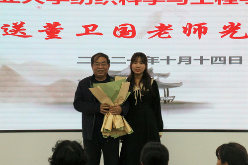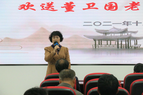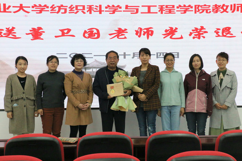 活动伊始,刘雍常务副院长介绍了董卫国副教授的事迹。董老师自1984年从业以来,醉心于高技术纤维及其复合材料方向研究,主持和参与完成包括国家863计划在内的国家级、省部级、企业横向课题20余项,获得国家发明专利十余项,主编或参编《新型纤维材料及其应用》等教材5部,发表论文50篇,获得2018年中国纺织联合会科技进步一等奖(第一完成人)、2019年山东省科技进步一等奖(第一完成人)、2019年中国纺织联合会发明专利金奖(第一发明人)等荣誉,为行业发展和学科建设做出了巨大的贡献。刘雍常务副院长指出,所有退休教师都是学院的宝贵财富,学院对每一位曾经在这里工作过的老师满怀感激之心。董老师始终坚守立德树人初心、爱岗敬业、默默奉献,他的精神值得大家学习。