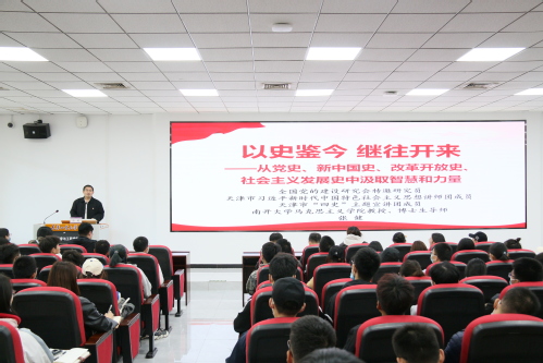 为深入贯彻落实习近平总书记在庆祝中国共产党成立100周年大会上的重要讲话精神,扎实推进学生党史学习教育走深走实,2021年10月19日下午,我校举办“自信大讲堂”第四场报告暨2021年天津市高校思想政治理论宣讲“教授团”巡讲活动。全国党的建设研究会特邀研究员,南开大学马克思主义学院教授、博士生导师张健应邀作了题为《以史鉴今,继往开来——从党史、新中国史、改革开放史、社会主义发展史中汲取智慧和力量》的报告。辅导员和学生代表200余人参加。报告会由党委学工部副部长方桂珍主持。