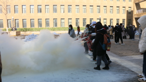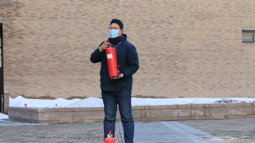 随后,保卫处消防安全管理科蒋晓阳老师对同学们的疏散演习进行总结。他指出,火灾发生时应确认火源方向及风向,并用湿毛巾或衣物捂住口鼻,压低身子,迅速从背向火源的安全通道撤离,并指出了师生必须掌握的两点技能:大火会逃生,小火会灭火。在灭火技能培训中,他向同学们详细介绍了二氧化碳灭火器及干粉灭火器的正确使用方法。最后,在场每一位师生排队按秩序进行了灭火器的实际操作。