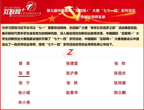 2021年12月27日,中国国际“互联网+”大学生创新创业大赛组委会和大赛展示交流中心公布了《第七届中国国际“互联网+”大赛“七个一百”系列活动优秀创业导师名单》,我校软件学院党委副书记兼纪委书记、校团委兼职副书记、创客空间创业导师张晋老师成功入选。