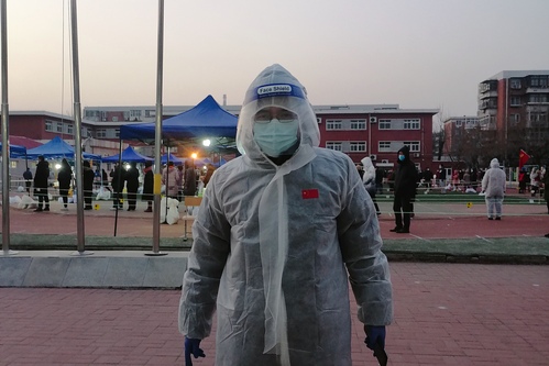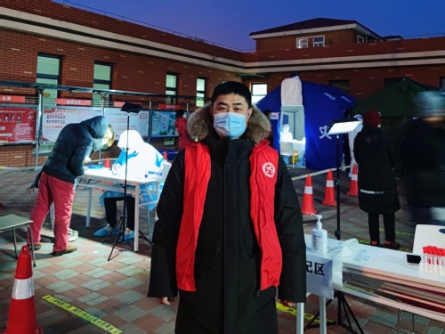 民盟盟员李庚雷老师在核酸筛查工作中负责维持检测通道秩序,把握好各栋楼居民依次下楼做核酸检测的时间,以便居民们随到随检,不受冻。“大家先测温,保持一米间隔,请提前准备好身份证。”这是一天中重复最多次的温馨提示。“谢谢,谢谢你们志愿者。”这是一天中听到最多次的暖心话。