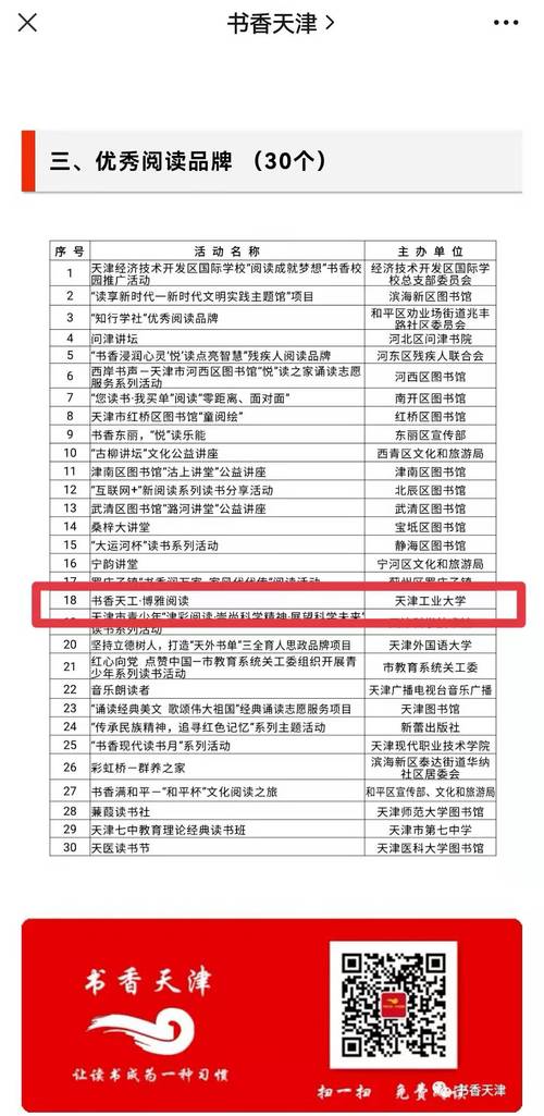 2021年书香天津“优秀读书人物”“新时代阅读推广人”“优秀阅读品牌”推荐评选工作由天津市全民阅读活动办公室在全市组织开展。为贯彻落实中宣部《关于促进全民阅读工作的意见》和《关于做好2021年全民阅读工作的通知》,以及市委市政府《关于深化全民阅读建设书香天津的意见》要求,根据《关于2021年书香天津全民阅读重点活动安排的通知》,经市全民阅读工作领导小组成员单位、各区委宣传部及相关单位审核推荐,组织专家初评、网络宣传、综合评审及线上公示,最终确定“优秀阅读品牌”30个。