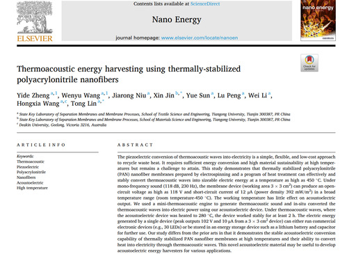 近年来,我校纺织科学与工程学院王闻宇教授和林童教授团队在新型纳米纤维压电聚合物材料研究方面取得一系列原创性研究成果。最近,该团队又在国际著名期刊《Nano Energy》(影响因子17.881)发表了题为《Thermoacoustic energy harvesting using thermally-stabilized polyacrylonitrile nanofibers》的文章,详细介绍了他们用超耐温聚丙烯腈压电纳米纤维实现将热能转换为电能的研究成果(论文链接:https://doi.org/10.1016/j.nanoen.2022.106995,纺织科学与工程学院博士生郑意德与王闻宇教授为共同第一作者,金欣教授与林童教授为通讯联络人)。