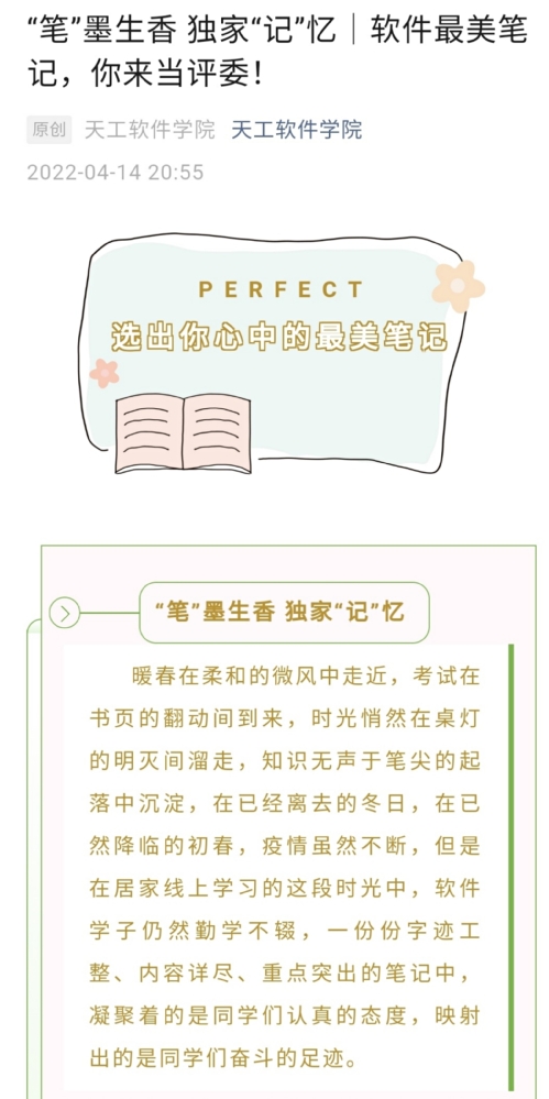 经过班级推荐后,学院通过公众号平台开展公开投票评比,师生积极响应,选出了各自心目中的最美笔记。