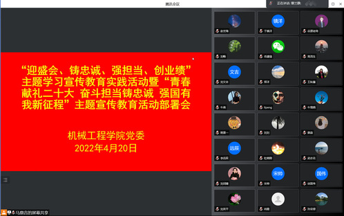 2022年4月20日下午,机械工程学院召开“迎盛会、铸忠诚、强担当、创业绩”主题学习宣传教育实践活动暨“青春献礼二十大 奋斗担当铸忠诚 强国有我新征程”主题宣传教育活动部署会议。会议以视频形式召开。学院党委委员、师生党支部书记、组织员、师生党员代表参加会议。
