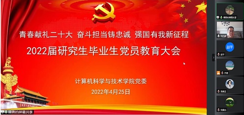 为进一步加强毕业生党员的教育管理,顺利推进2022届毕业生党员党组织关系转接,4月25日下午,计算机科学与技术学院党委通过腾讯会议召开“青春献礼二十大 奋斗担当铸忠诚 强国有我新征程”2022届毕业生党员教育大会。学院党委书记闫凡雷、党委副书记田旭及组织员、辅导员、全体研究生毕业生党员共28人参加会议。