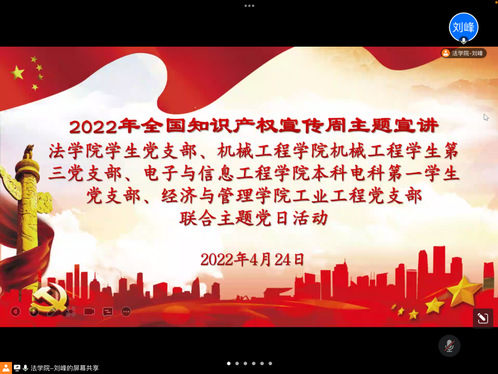 为充分发挥法学学科专业特点,推动“我为群众办实事”实践活动走深走实,将知识产权宣传教育与普法志愿服务有机融合,4月24日,法学院学生党支部和机械工程学院机械工程学生第三党支部、电子与信息工程学院本科电科第一学生党支部、经济与管理学院工业工程党支部在线上开展了“2022年全国知识产权宣传周主题宣讲暨联合主题党日”活动。参加活动的师生首先观看了2022年全国知识产权宣传周主题宣传片。随后的宣讲环节,法学研究生第二党支部书记、专利代理师李享老师为师生带来了《企业高价值专利的认定和维护》的专题讲座。法学院“法垒锋行”宣讲团成员潘雯雯、何雪儿、马浩然和宋涵婧同学分别作了《我国有关知识产权保护的法律法规》《世界知识产权日——知识产权与青年》《知识产权的历史演进与新时代知识产权强国建设新征程》《2021年我国知识产权典型案例分享》的专题宣讲。宣讲重点以我国知识产权保护相关法律法规为切入点,展现了新时代的中国青年尊重知识、崇尚创新的良好精神风貌。