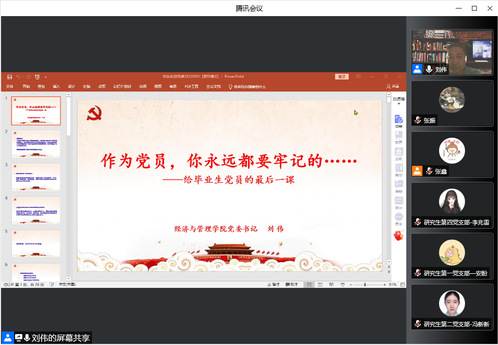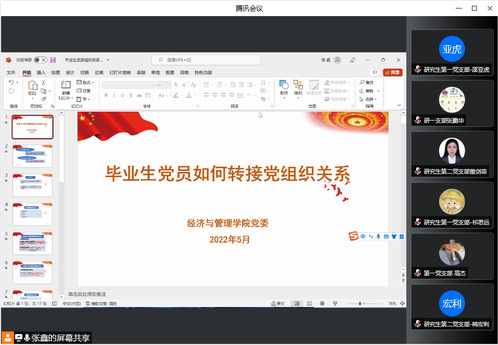 2022年5月1日,经济与管理学院党委通过线上形式开展了“青春献礼二十大 奋斗担当铸忠诚 强国有我新征程”研究生毕业生党员主题教育活动。学院党委书记刘伟2022届研究生毕业生党员讲授“作为党员,你永远都要牢记的…”专题党课。学院全体辅导员及全体研究生毕业生党员共计70余人参加此次主题活动。