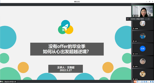 王雅超老师以“没有offer的毕业季,如何从心出发超越逆境”为主题,针对在疫情反复、工作难找的背景下,如何理解当下的焦灼,如何用积极心理学寻找能量、缓解情绪、减轻压力等方面向大家展开了详细的讲解。她结合亲身经历向大家分享了自己的复原力、乐观以及希望三成分,并希望同学们可以利用心理学智慧应对学业与就业压力,战胜挫折,超越逆境,获得选择的机会,拥有选择的自由,祝愿同学们依然葆有韧性、乐观和希望。