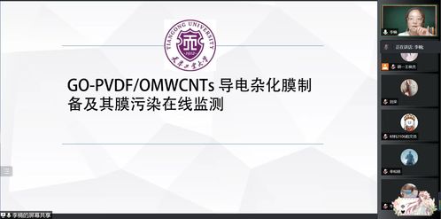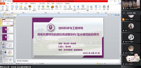 硕士第一党支部陈冰倩作题为《具有抗菌特性的疏松纳滤膜染料/盐分离性能的研究》的报告,介绍了一种通过改变物料配比,改善疏松纳滤膜的调节渗透截留性能,并使其获得优异的缓释抗菌效果的工艺方法;孙凯旋作题为《PTFE纳米纤维膜孔结构优化及其在膜乳化中的应用》的报告,该研究优化了PTFE纳米纤维膜孔的结构,解决静电纺丝PTFE纳米纤维膜三维网络孔结构不适用于膜乳化工艺的问题;窦小庆作题为《环氧化物和环酐的开环交替共聚》的报告,聚焦基础理论研究,证实了碱金属羧酸盐可以有效催化环氧化物和环酸酐的开环交替共聚;李楠作题为《多功能PVDF/CNT/GO混合超滤膜用于污染监测》的报告,提出了一种通过测量膜电阻来实现膜污染实时监测的有效方法。与会教师、学生针对汇报展开了深入研讨交流。