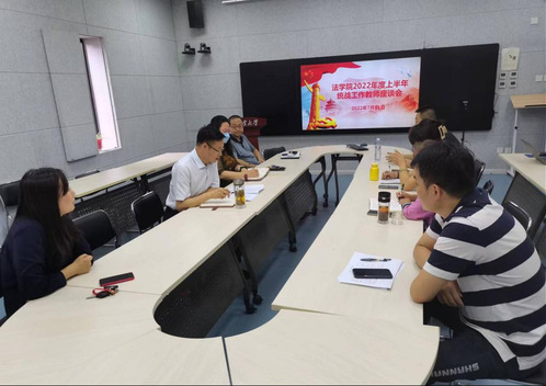 2022年7月11日上午,法学院在309会议室召开2022年度上半年统战工作教师座谈会。学院领导班子成员、党外教师代表参加会议。座谈会由学院党委书记王国武主持。