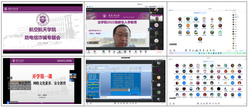 为提高师生网络安全防范意识,杜绝校园电信诈骗情况的发生,各学院采用线上方式举行“防电信诈骗专题讲座”“网络安全教育大课堂”“网络素养安全教育主题班会”等活动。