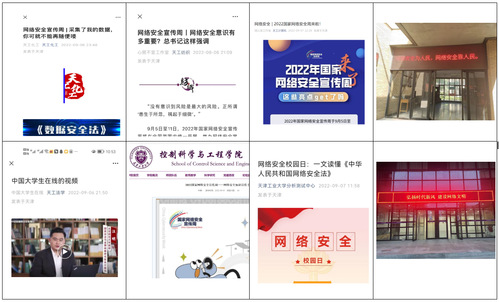 2022年9月6日至11日是2022年国家网络安全宣传周。在宣传周期间,天津工业大学各单位联动,以“网络安全为人民,网络安全靠人民”为主题,组织开展了线上“网络安全、数据安全”专题培训、“防电信诈骗专题会”专题讲座、教师专题会议,发放网络安全宣传电子资料,张贴网络安全宣传海报,LED屏滚动播放相关宣传标语,组织师生参与“高校师生同上一堂网络安全课”等系列活动,有效发动师生广泛参与网络安全教育活动,提升了师生的网络安全意识和网络安全风险防范能力。