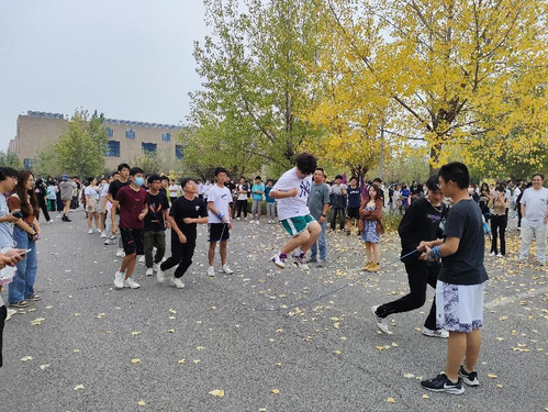 比赛当天,一面面院旗飘扬,一支支队伍早早就在场地上集结完毕,同学们个个精神抖擞、信心十足,开始紧张的赛前准备和预热。比赛中,每支队伍的22名参赛学生通力合作,奋力争先。摇绳的同学凝神静气,有节奏地挥动着双臂,手中的跳绳在空中舞出一条优美的弧线。场上一个接一个矫健的身姿穿梭在舞动的长绳中,同学们神情专注,动作敏捷,展现出青春的律动和风采。大绳炫舞着,青春跳跃着,在蓝天、秋叶的衬托下,成为一幅美丽的校园风景画。