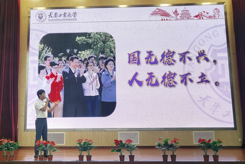 梁哲分享的题目是《“典”亮新时代——在平“语”近人中感悟传统文化,追寻伟大足迹》,参阅著作为《平“语”近人:习近平总书记用典》。他结合自己暑期走进浙江安吉、福建下党等地开展“追寻伟大足迹”的经历,讲述了习近平总书记“利民之事,丝发必兴;厉民之事,毫末必去”的为民情怀。他声情并茂的分享赢得了场内观众的阵阵掌声,展现了天工学子传承红色基因、勇担历史使命的青春风采。