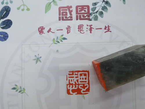 活动伊始,彭涌老师首先为同学们普及了篆刻工具、所用石材及篆刻程序等方面的基础知识,介绍了中国篆刻艺术的发展历程和审美特性,现场演示了篆刻的基本步骤,帮助大家了解中国文字书与刻的关系,体验方寸天地、气象万千的艺术内涵。在篆刻体验环节,每名同学设计了独一无二的感恩印章,在老师的耐心指导下将这枚感恩印章印刻出来。