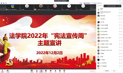 为深入学习宣传贯彻党的二十大精神,深入学习贯彻习近平法治思想,教育引导广大师生弘扬宪法精神、增强法治观念,深入推进八五普法和法治校园建设,12月2日,法学院线上开展2022年“宪法宣传周”主题宣讲活动。来自法学院、计算机科学与技术学院、软件学院、经济与管理学院的师生以及学校“卓越管理者培养计划”学员代表、第六期“青马工程”学员代表共180余人参与活动。宣讲活动由法学院组织员刘峰老师主持。