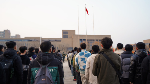 在全体师生的注目下,英姿勃发的国旗护卫队迈着铿锵有力、整齐划一的步伐护送五星红旗入场。伴着雄壮嘹亮的国歌声,五星红旗冉冉升起。师生们满怀敬意向国旗行注目礼,表达对伟大祖国深深的祝福和崇高的敬意。