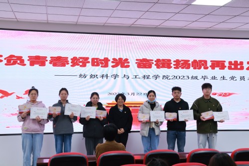 3月22日,在2023届毕业生党员即将离开学校、奔赴新的学习和工作岗位之际,纺织科学与工程学院党委组织召开了“不负青春好时光 奋楫扬帆再出发”2023届毕业生党员教育大会。学院党委书记胡艳丽、学办主任赵凯娜、组织员马晓燕及全体毕业生党员出席本次会议。