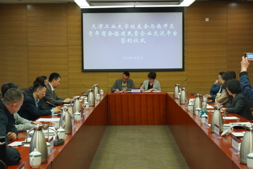 为深入贯彻党的二十大精神,落实我市“十项行动”,推动产学研融合创新发展,2023年4月21日我校与南开区工商联联合组织部分民营企业到我校开展学访交流。南开区区委统战部副部长、工商联党组书记、常务副主席杜盛杰带队,南开区嘉陵道街办事处工委书记李怡、南开区工商联四级调研员王小康、南开区知识产权保护协会会长陈玺名,南开区青年商会副会长、天津人环科技有限公司董事长刘晓辉校友及20余名企业家参加活动。校党委常委、组织部长沈浩鹏,校党委常委、统战部长陈华,工业技术研究院、校友工作办公室、学生处相关负责人参与接待并与杜盛杰书记一行进行座谈。