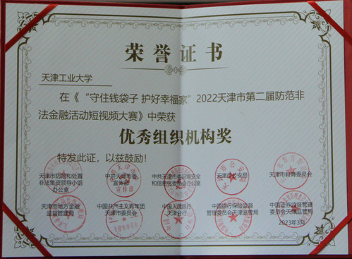 近日,“‘守住钱袋子,护好幸福家’2022年天津市第二届防范非法金融活动短视频大赛”遴选结果公布,我校荣获优秀组织机构奖。