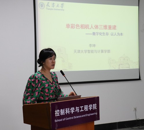 李坤教授作了题为“单彩色相机人体三维重建”的学术报告,介绍了团队在单彩色相机Avatar重建、实时穿衣人体三维重建、3D内体重建和大场景下群体三维重建等方面的最新研究工作,介绍了高效灵活的三维几何表示——傅里叶占有率场(FOF)和基于FOF构建的国际首个30+FPS的高质量实时单彩色相机的人体三维重建框架,并展示了针对宽视场大场景多人重建问题所提出的首个可以从单张大场景图像中重建全局一致的数百人3D姿态、形状与位置的方法Crowd3D以及基准数据集LargeCrowd。