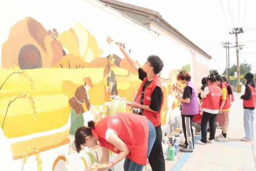 在滨海新区杨家泊镇西庄坨、东庄坨村,同学们发挥专业特长,构图、分工、上色、描绘……每一步都认真仔细,精心勾勒出每一根线条。经过反复打磨,最终完成了两个墙面、总面积达80多平方米的墙绘。一幅幅以桃花、丰收为主题的图画跃然墙上,在保留了乡村气息的同时,让原本老旧的墙壁变得色彩斑斓、多姿多彩。鲜明的墙绘图,受到村民们的广泛好评。同学们纷纷表示,能够发挥自己的特长,尽自己的绵薄之力,让村民们的生活环境更美,让村庄变得更加富有文化氛围,心里很有成就感。